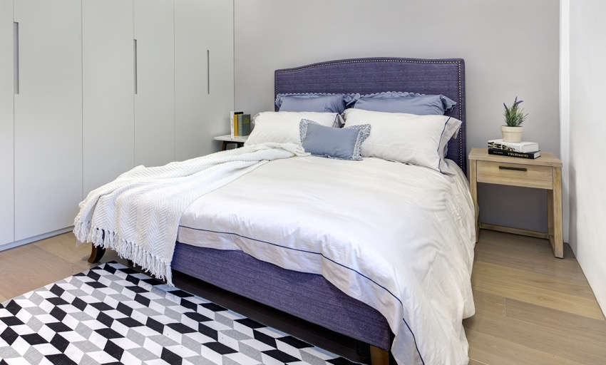 灰藍(lán)色織紋布料床 營(yíng)造適合睡眠的舒適視覺(jué)