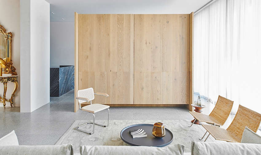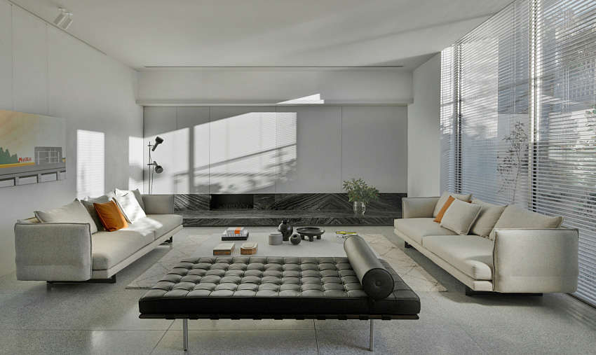 穿越過(guò)一旁綠意廊道,即可到達(dá)房屋內(nèi)部,先于壁面透過(guò)威尼斯石膏藝術(shù)涂料延續(xù)外在凈白色調(diào),并于窗戶設(shè)置百葉簾,讓自然光經(jīng)由間隙流瀉而入,使墻面隨著時(shí)光流逝,呈現(xiàn)獨(dú)特風(fēng)貌。