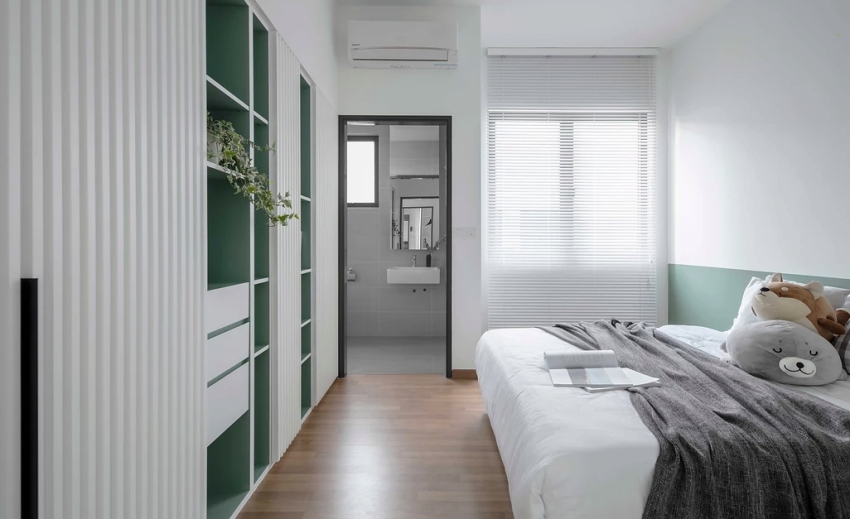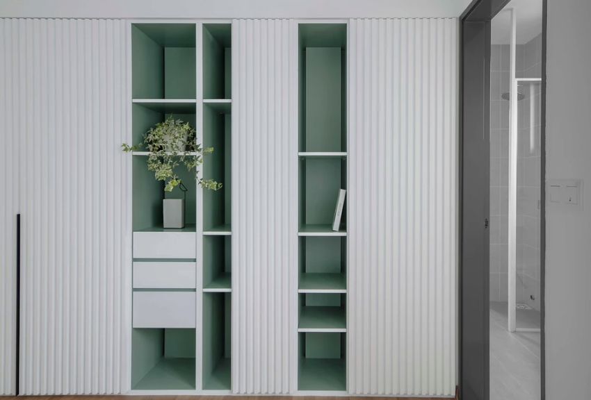 此手法同樣運(yùn)用于床頭墻與更衣間,構(gòu)成和諧且連貫的效果,次臥房則將格柵轉(zhuǎn)化為純白柜體門片,搭襯霧杉綠跳色開放展架,反倒襯托出自然清新氣息,展現(xiàn)格柵的多變可能性。