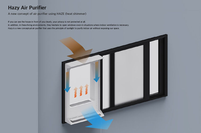 Hazy 空氣凈化窗是一扇能夠確保隱私性的窗戶,能確保在不開窗狀況下,提供適當(dāng)通風(fēng)功能,采用「霧氣」概念,裝置配有一個通風(fēng)孔與過濾器,利用陽光加熱室內(nèi)空氣,達(dá)到凈化室內(nèi)空氣質(zhì)量效果,同時透過熱霧形成朦朧屏風(fēng),藉以遮擋鄰側(cè)視線。