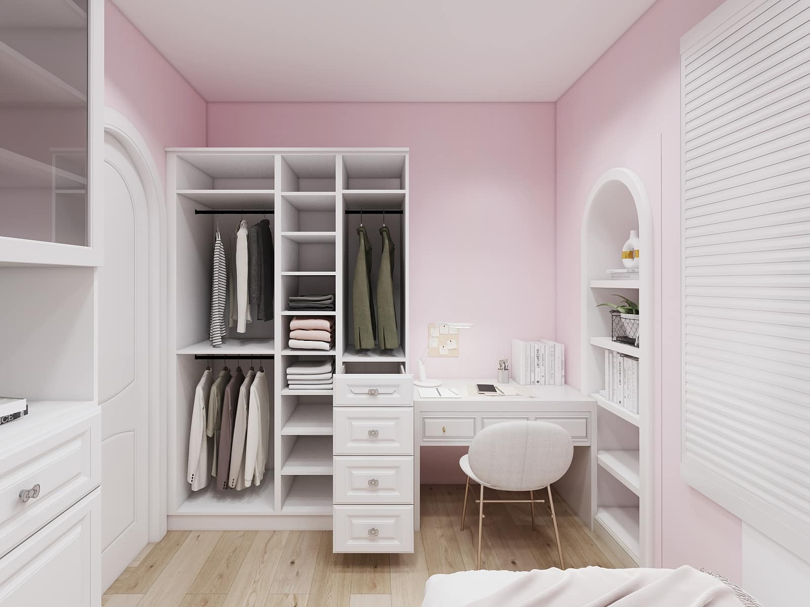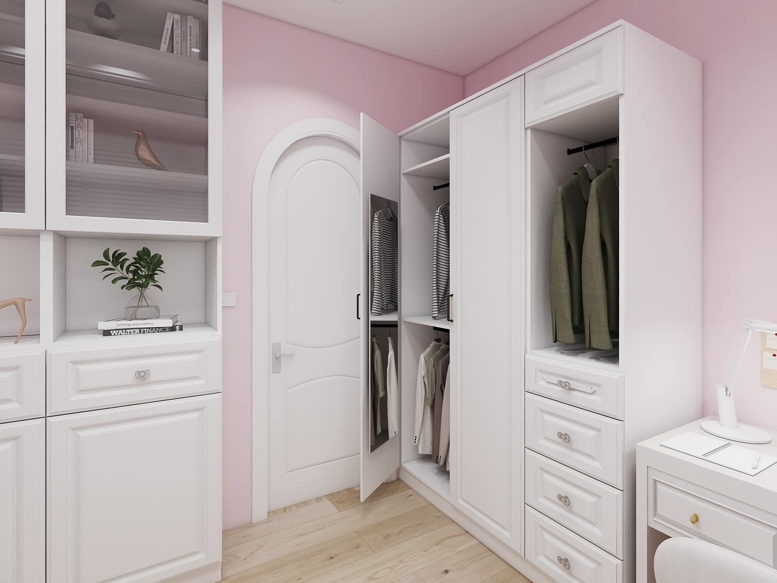 在童趣世界里增添幾分趣味,衣柜根據(jù)需求安排了全身鏡,提供穿衣搭配使用。在配置上規(guī)劃了一個二次衣柜,提供換洗衣物收納空間。