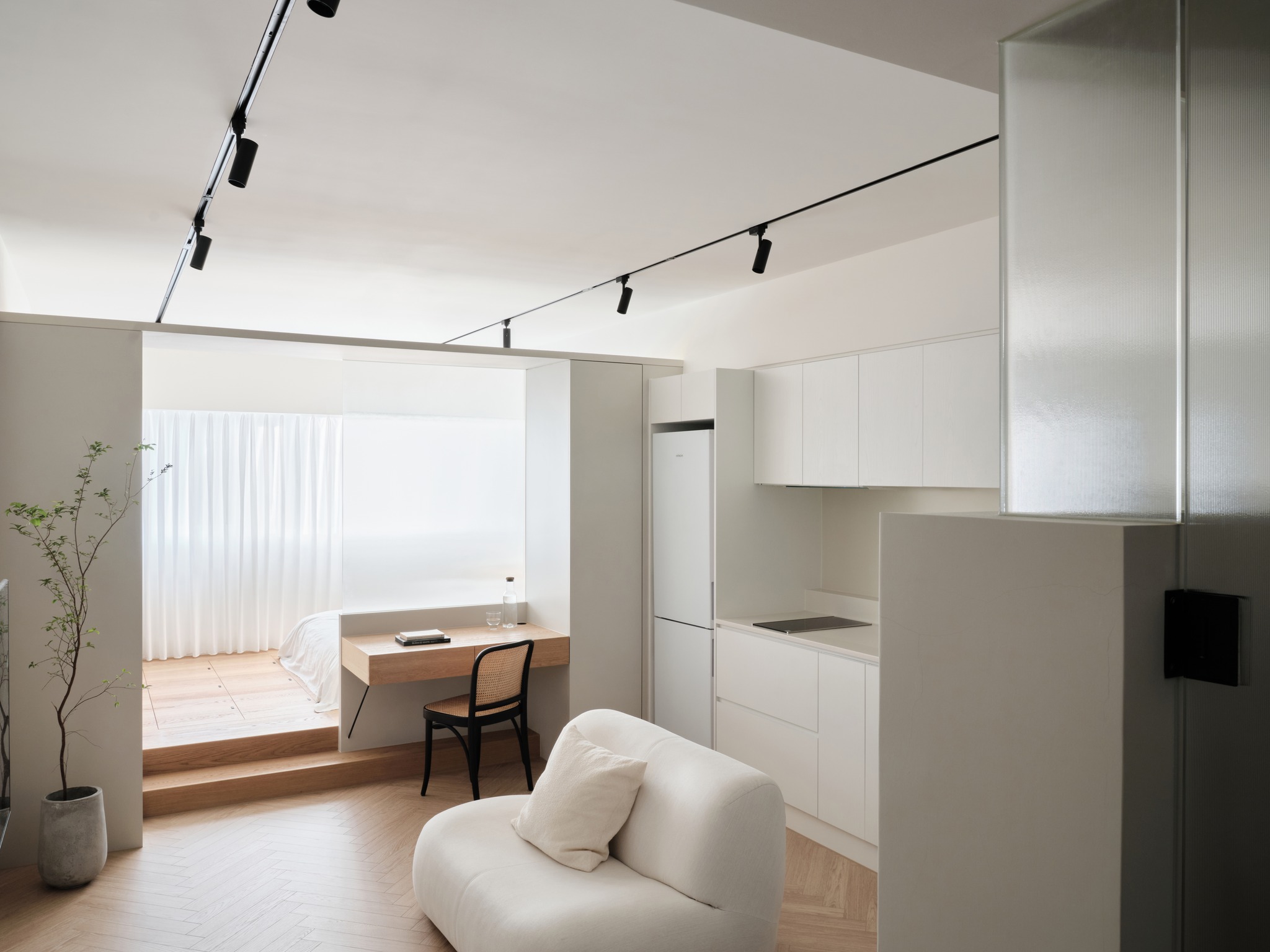 在一個長條形的45平方米住宅中,我們著重考慮了生活功能和采光。