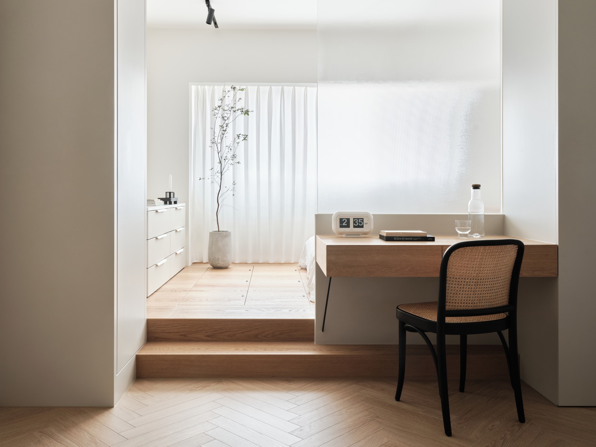 此外,通過在過道上設(shè)置床室和公共區(qū)域的分隔,上下的臺階和工作桌被置于同一平面上,這使得自然光可以直接或間接地照入室內(nèi),創(chuàng)造了美麗的窗景。