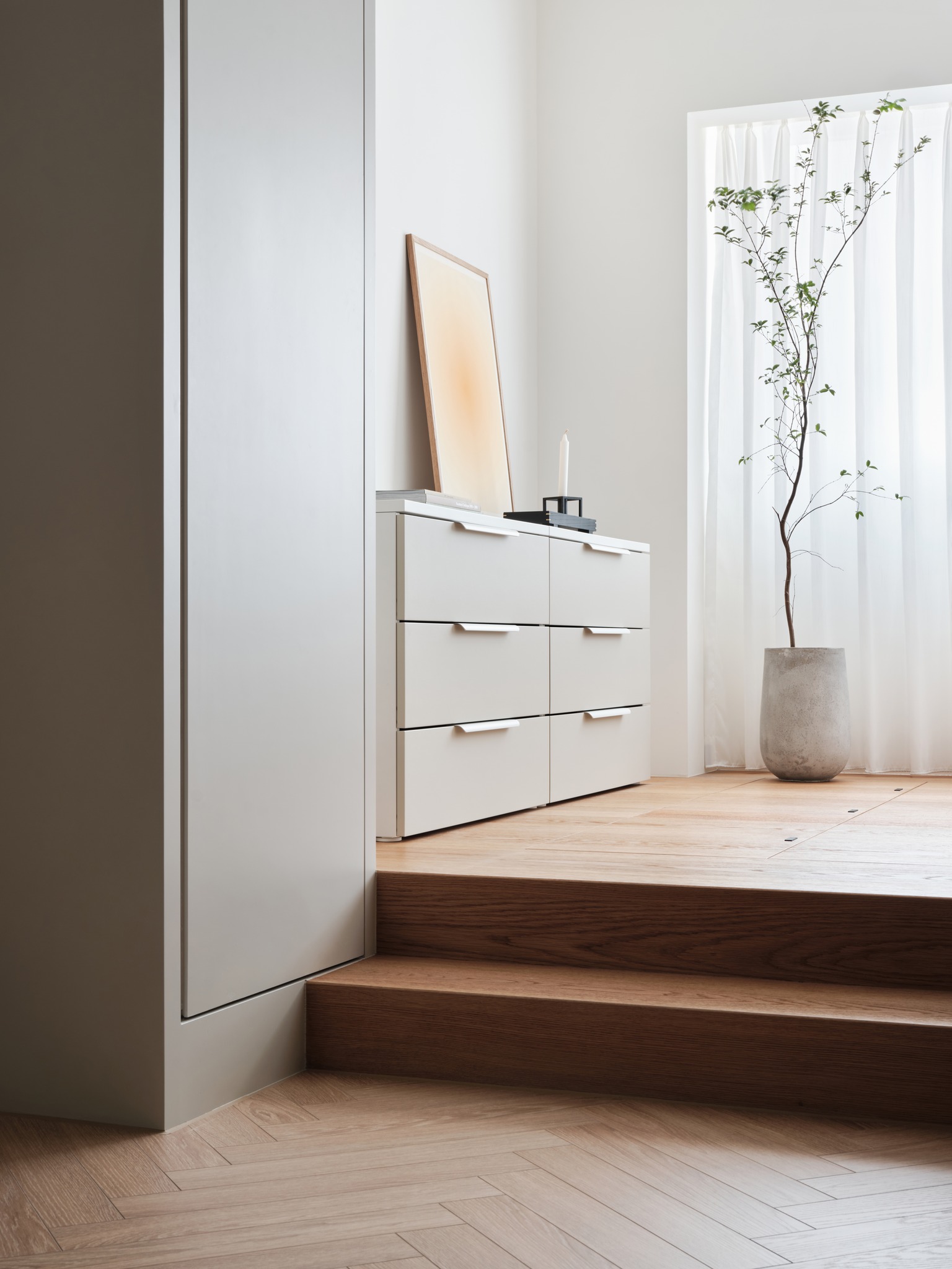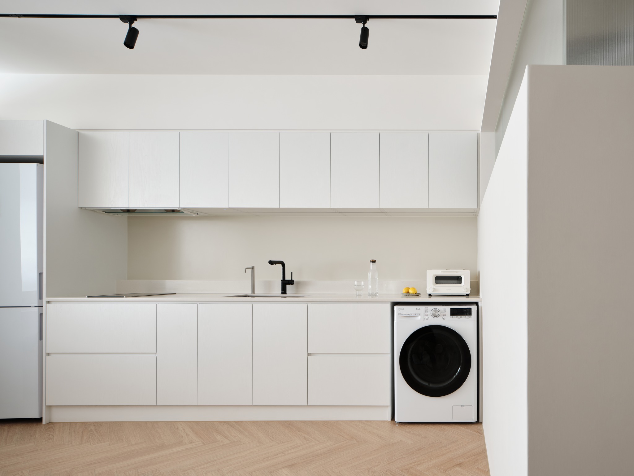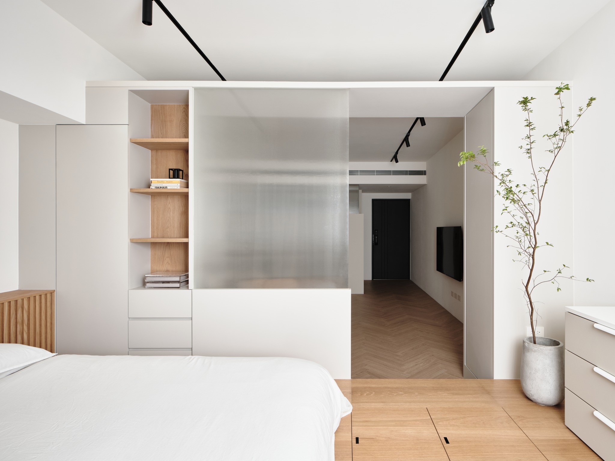 為了最大程度地整合儲物功能,我們在空間中使用了雙面布局,避免了分隔墻壁阻礙采光。