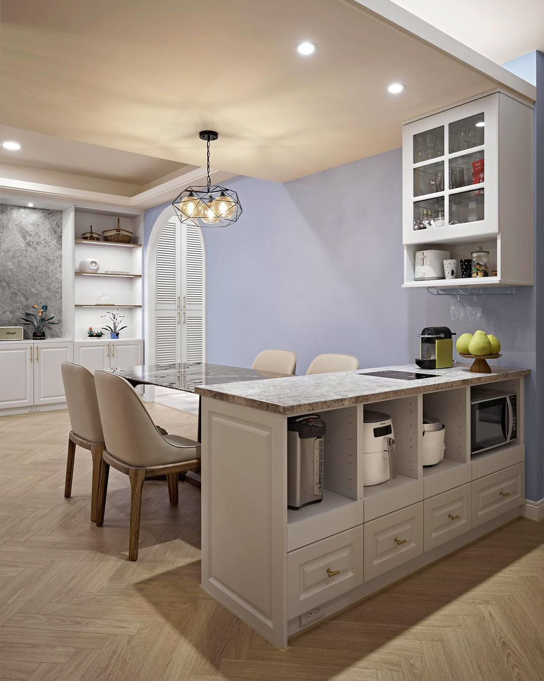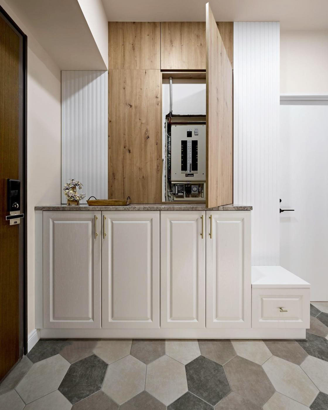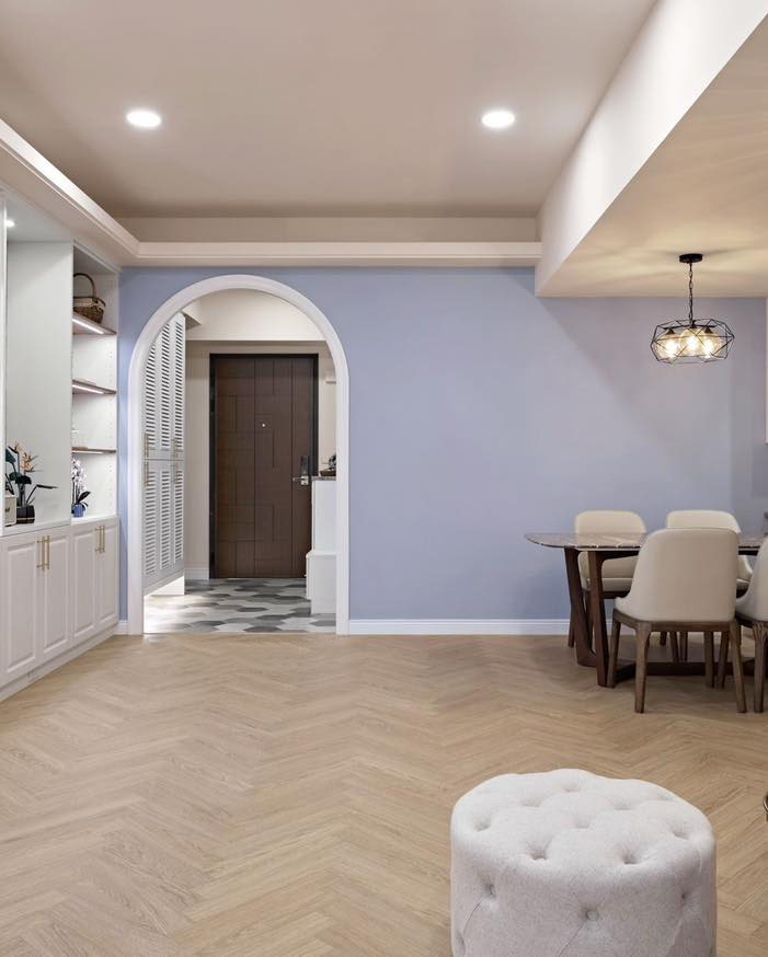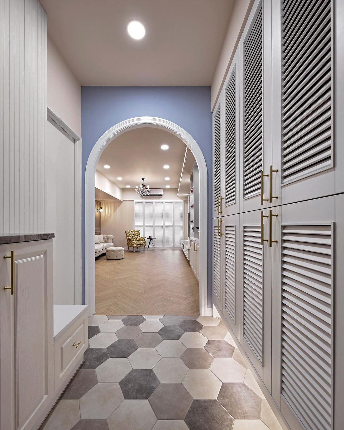 一打開門,您會看到花磚與人字拼花木地板相得益彰。在右側(cè),一個巨大的百葉鞋柜與優(yōu)雅的茶色鏡子相連,而在左側(cè),巧妙地遮擋了電箱,并提供了穿鞋的舒適椅子。當(dāng)您邁進(jìn)大圓弧拱門時,右側(cè)整個墻面設(shè)計成一個寬敞的收納空間。