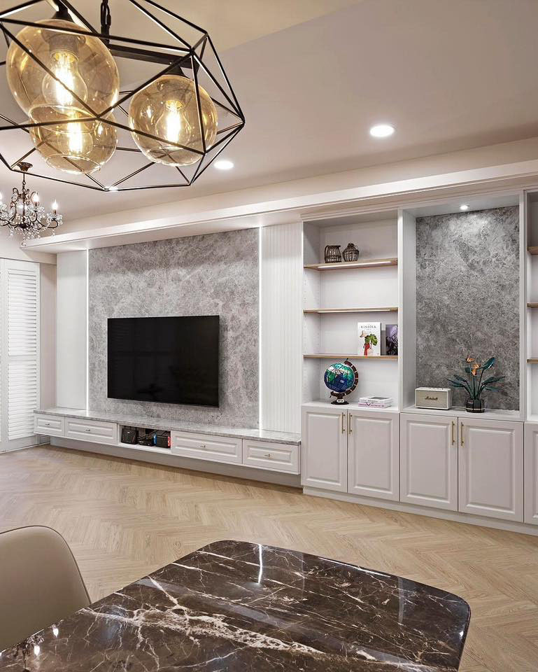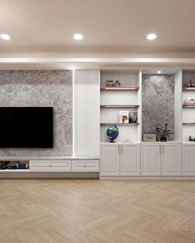 首先,有一個與燈條相協(xié)調(diào)的展示柜臺,可以隨時更換展品。電視柜由大理石背景呼應(yīng),氣氛宏偉壯觀,而線條燈和柵格板增添了視覺亮點。