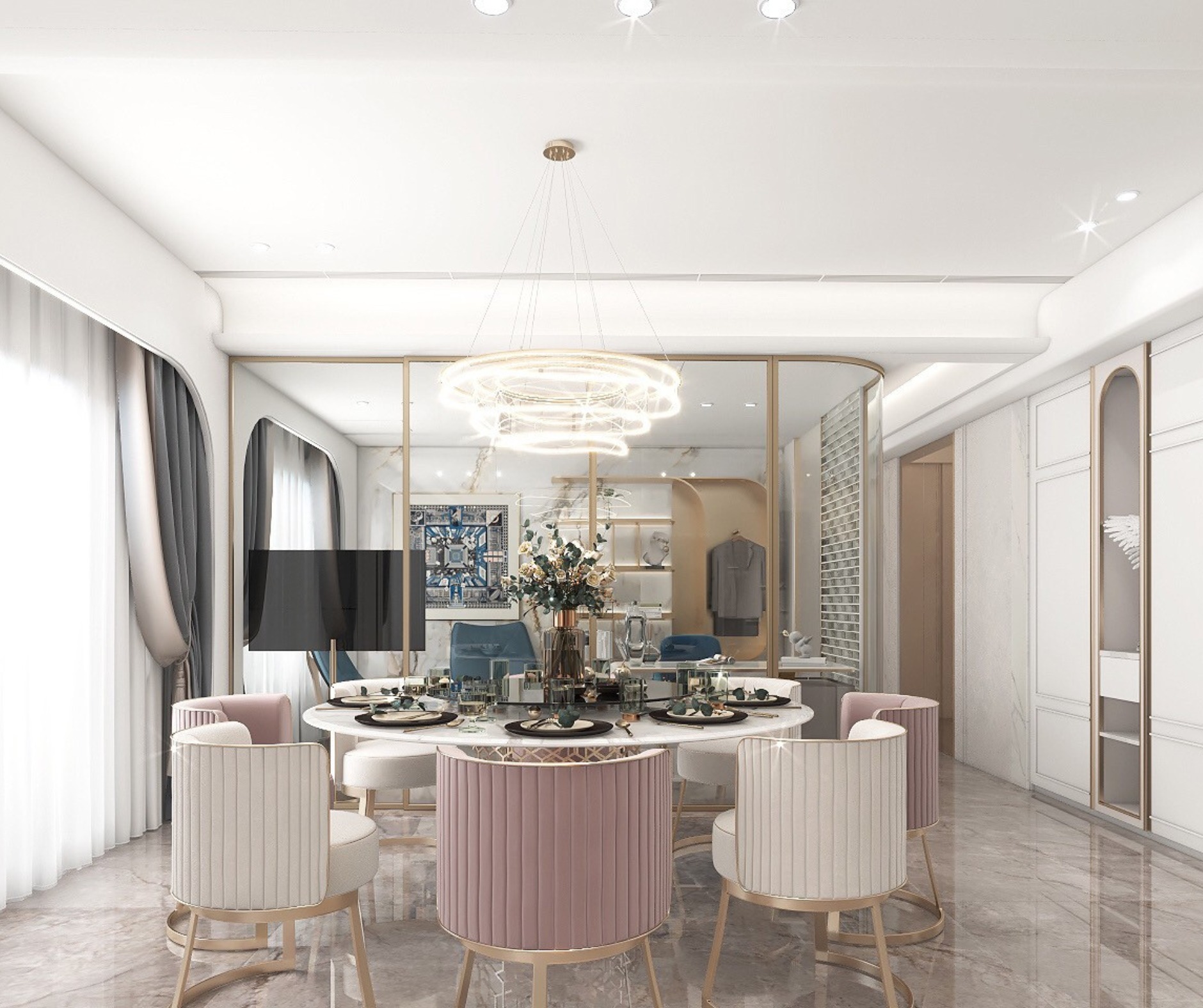 輕奢法式浪漫風(fēng)格的家裝強(qiáng)調(diào)淡雅的色彩,如淡粉、淡藍(lán)、米色和灰色。在這個(gè)案例中,客廳和餐廳的墻壁采用了淺粉色和灰色的調(diào)配,營造出溫馨而寧靜的氛圍。家具和裝飾品則選用了金色、銅色和銀色的裝飾,為空間增添了輕奢感。