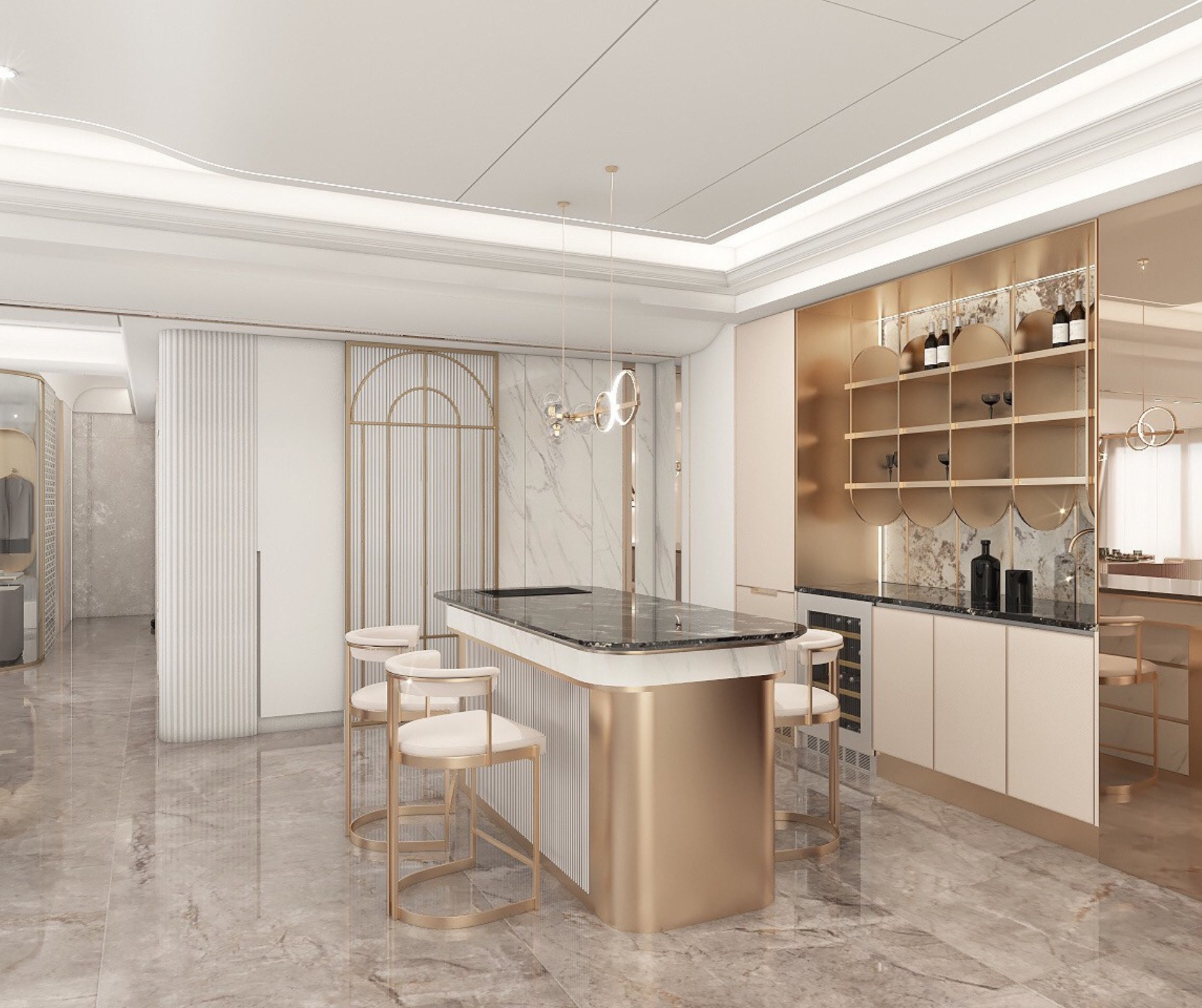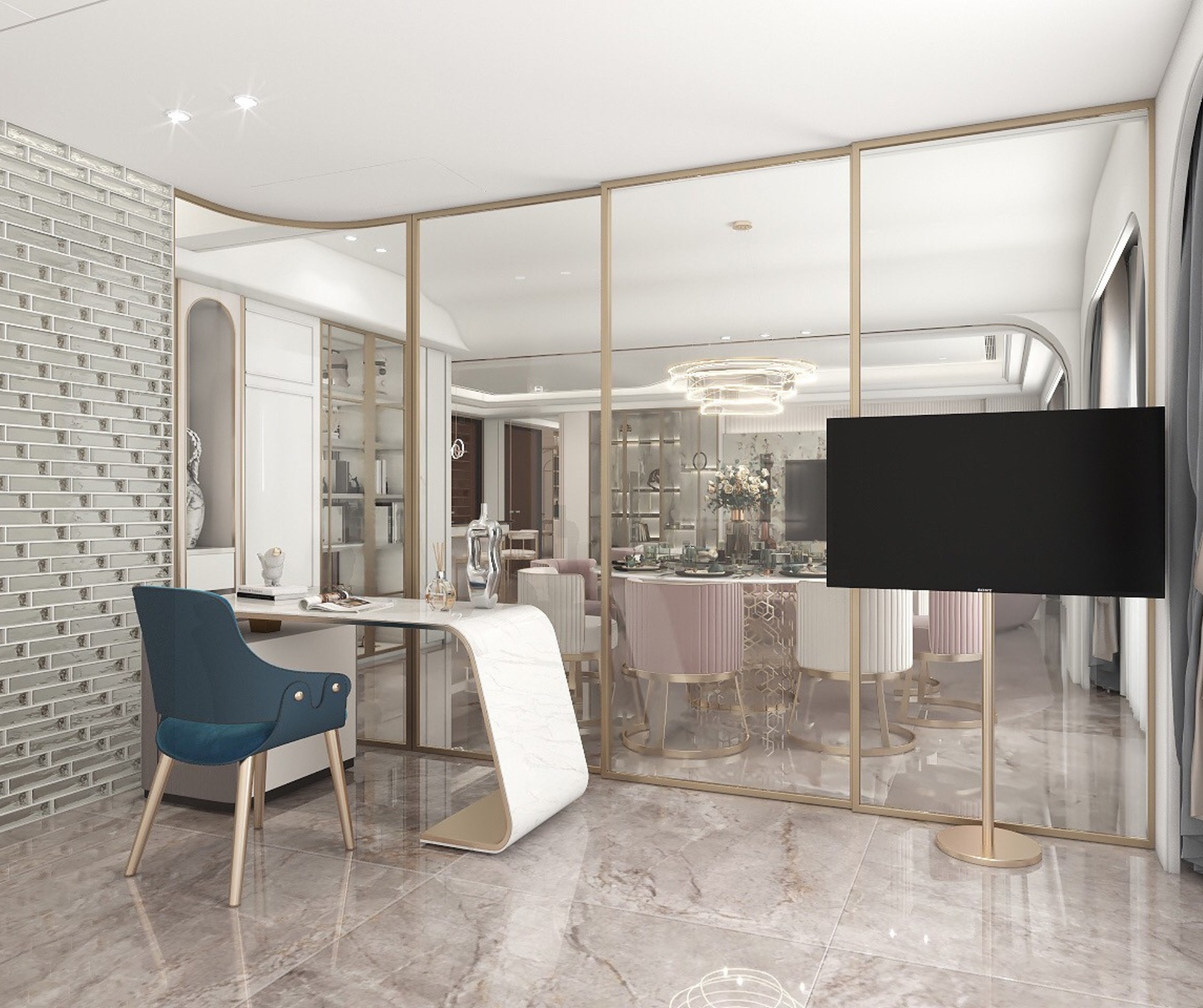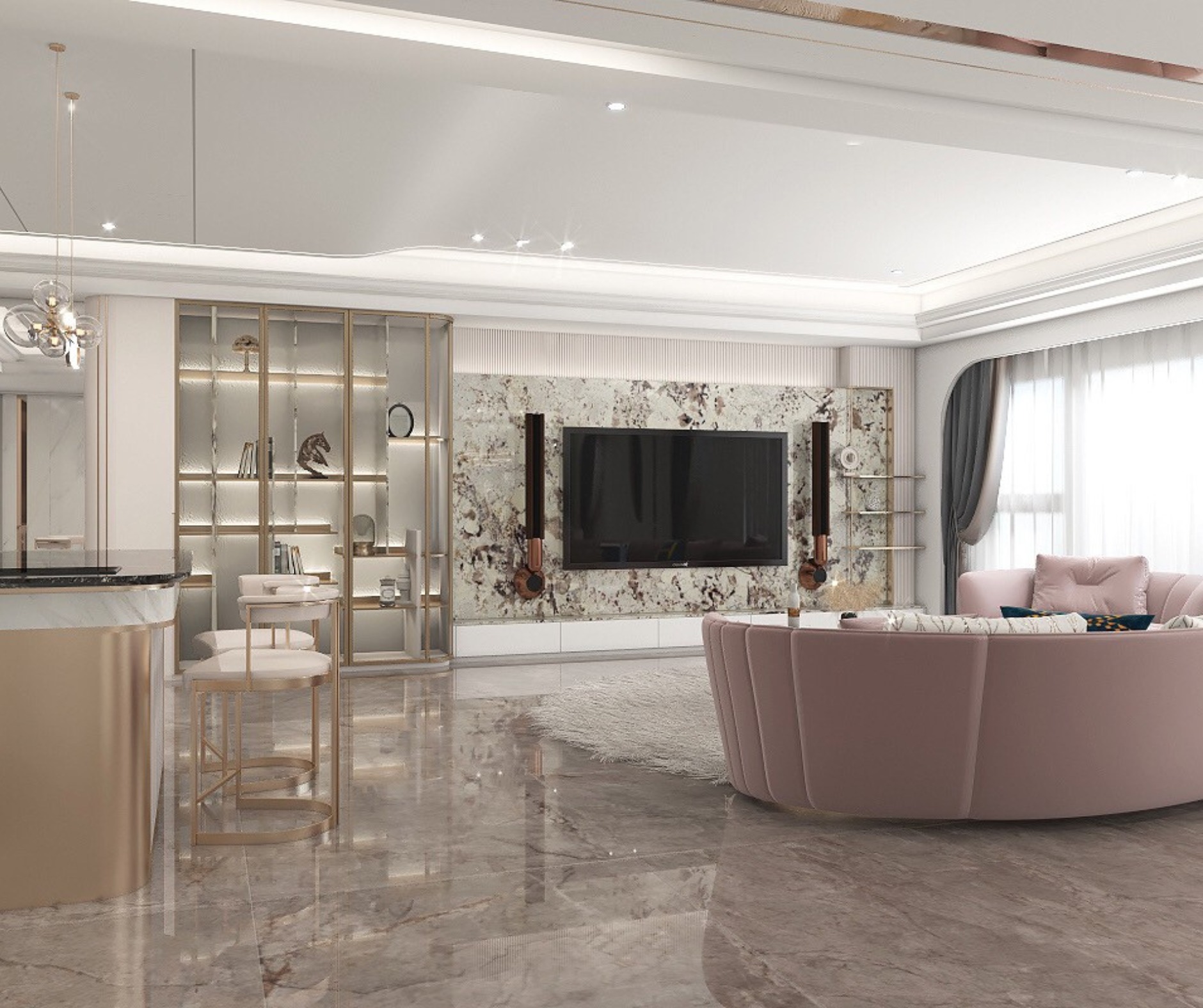 在輕奢法式浪漫風(fēng)格中,家具通常以曲線和雕花為特點(diǎn)。案例中的客廳使用了細(xì)膩的法式家具,如彎曲的沙發(fā)和鑲嵌花紋的咖啡桌,傳達(dá)出法國古典風(fēng)格的韻味。此外,家具的材質(zhì)也重要,可以選擇天然木材和亞麻布料,以增加舒適感。