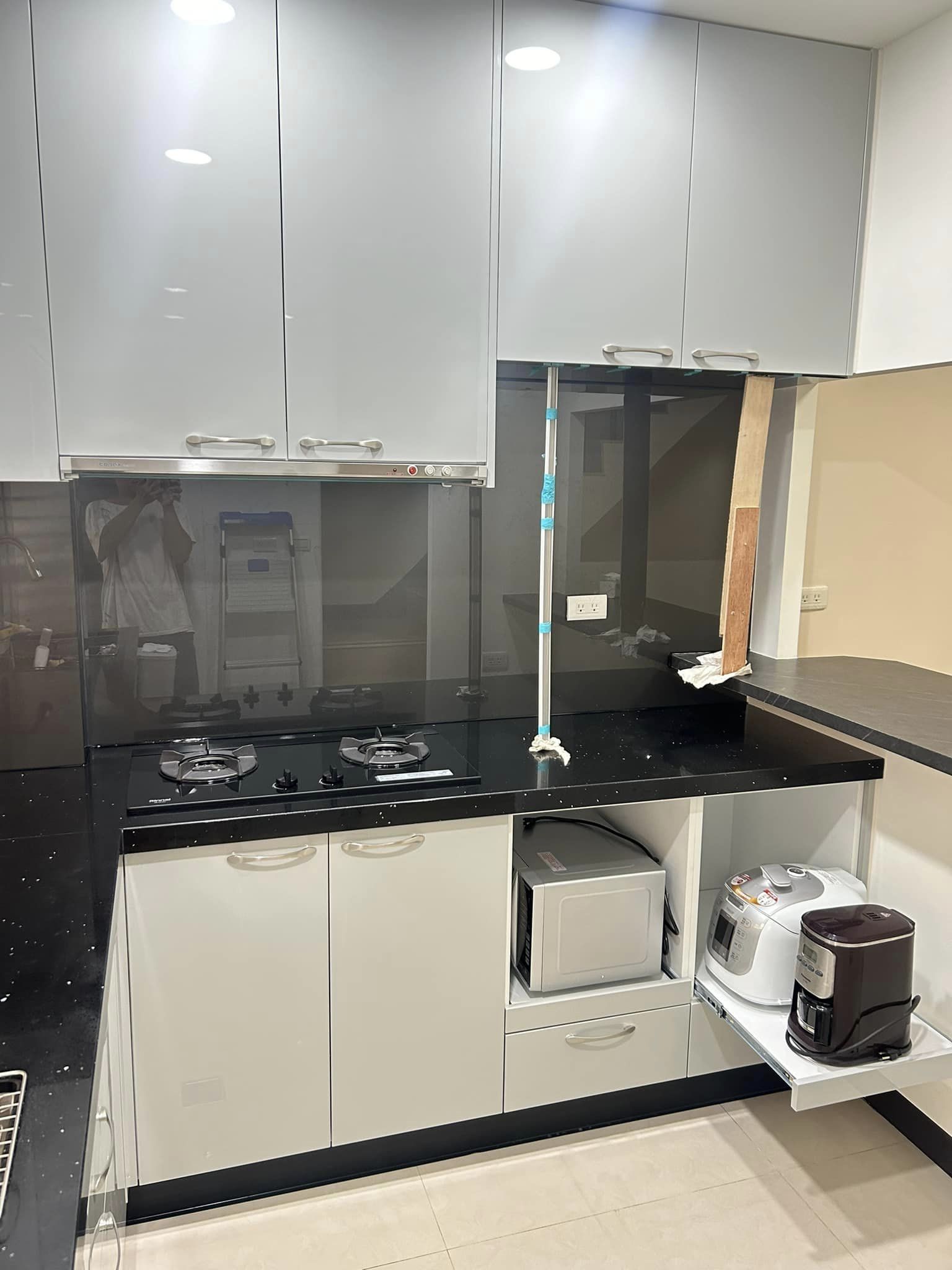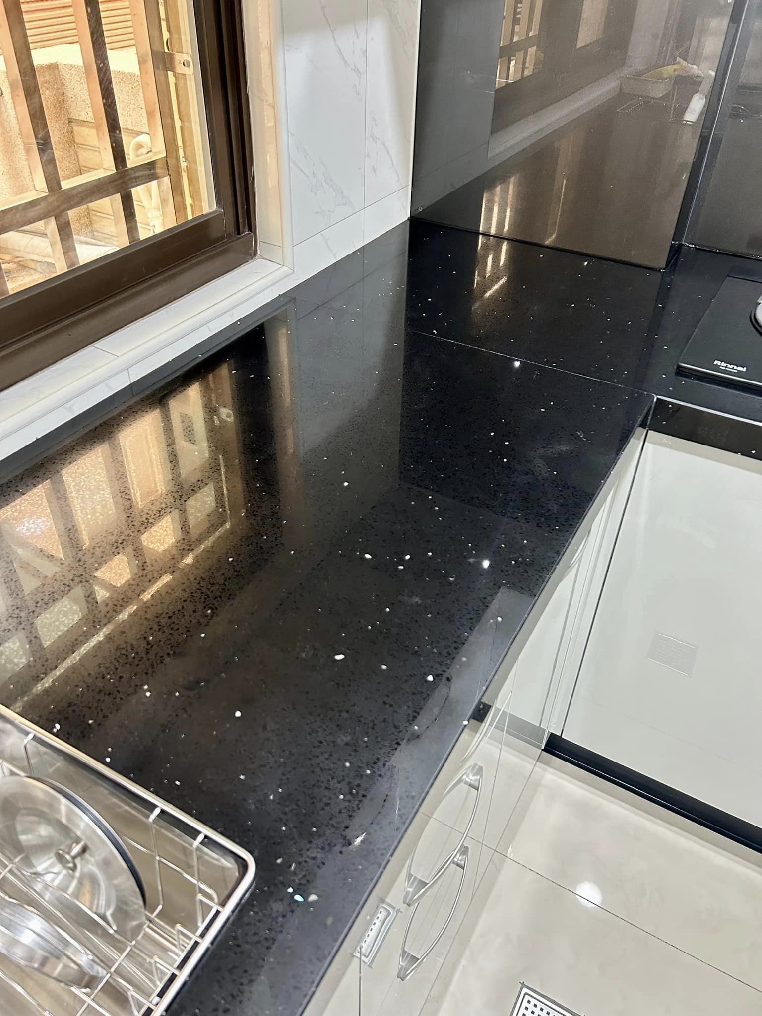 為了增加對(duì)比度和深度,我們選擇了黑色廚柜臺(tái)面。這些臺(tái)面不僅美觀,還耐用且易于清潔,抵抗磨損和污漬,使整個(gè)廚房看起來更加引人注目。