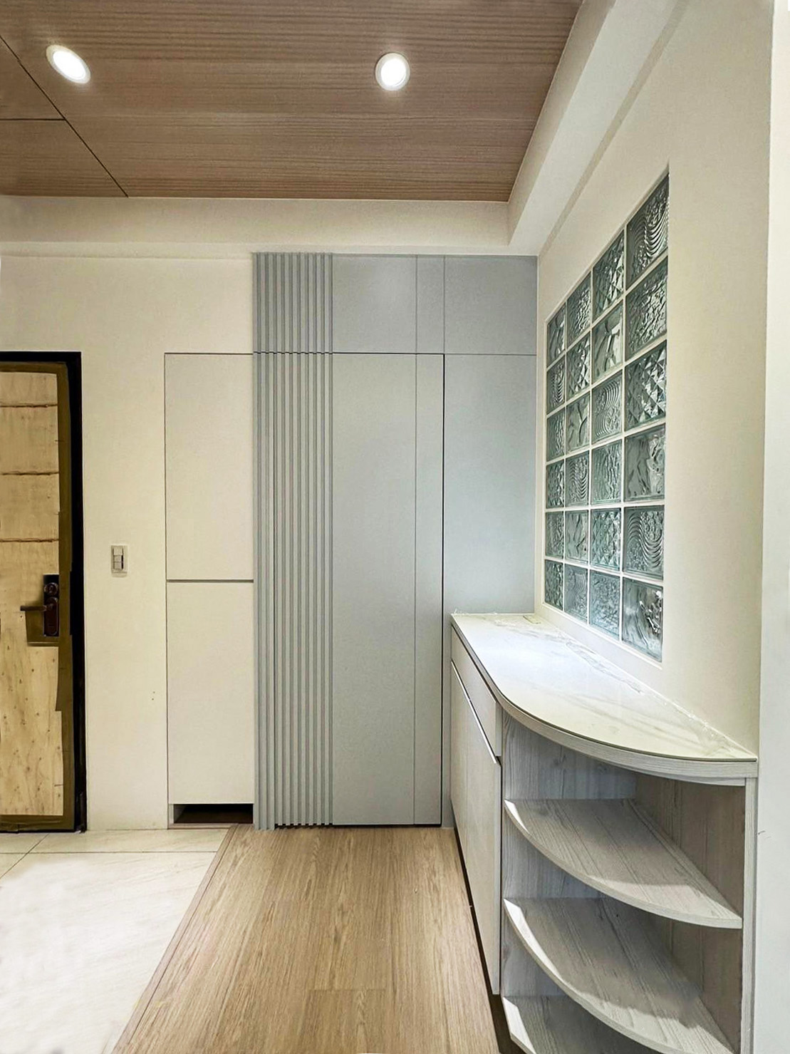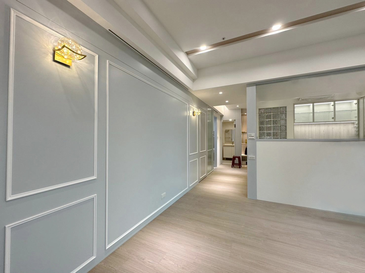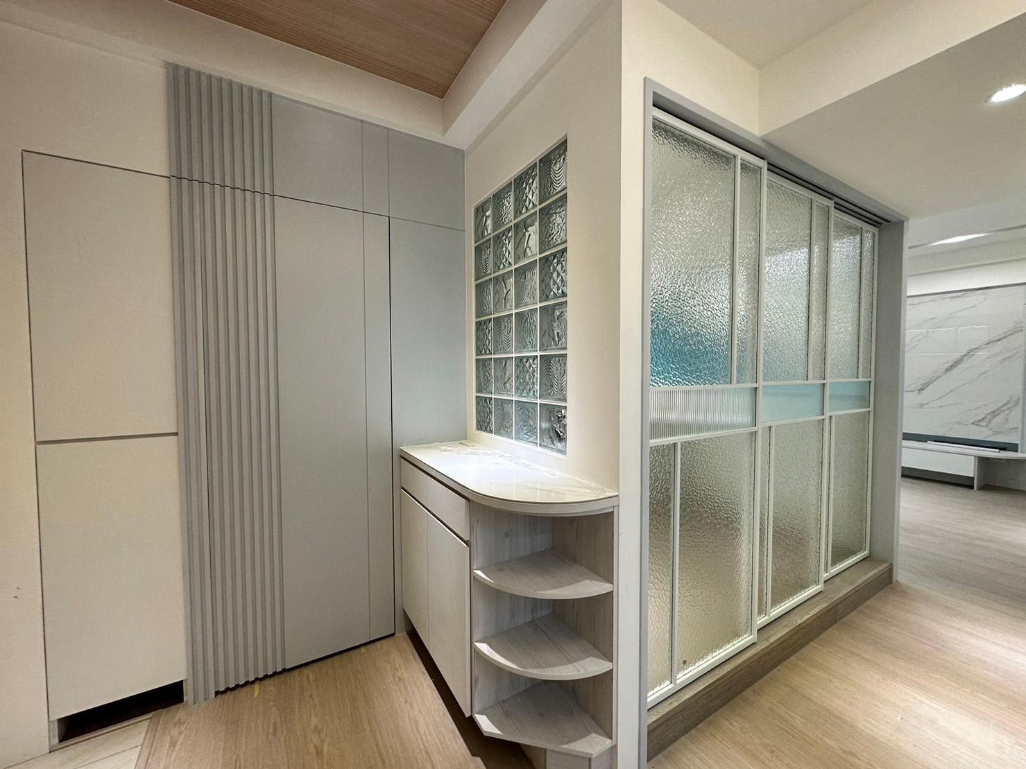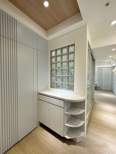 玻璃磚的運用使空間充滿了透明感和輕盈感。這種獨特的建材既可以作為隔斷,分隔出不同功能區(qū)域,又能讓光線自由穿透,使整個空間更加通透明亮。玻璃磚的不透明性讓空間充滿神秘感,同時還能有效地保持私密性。
