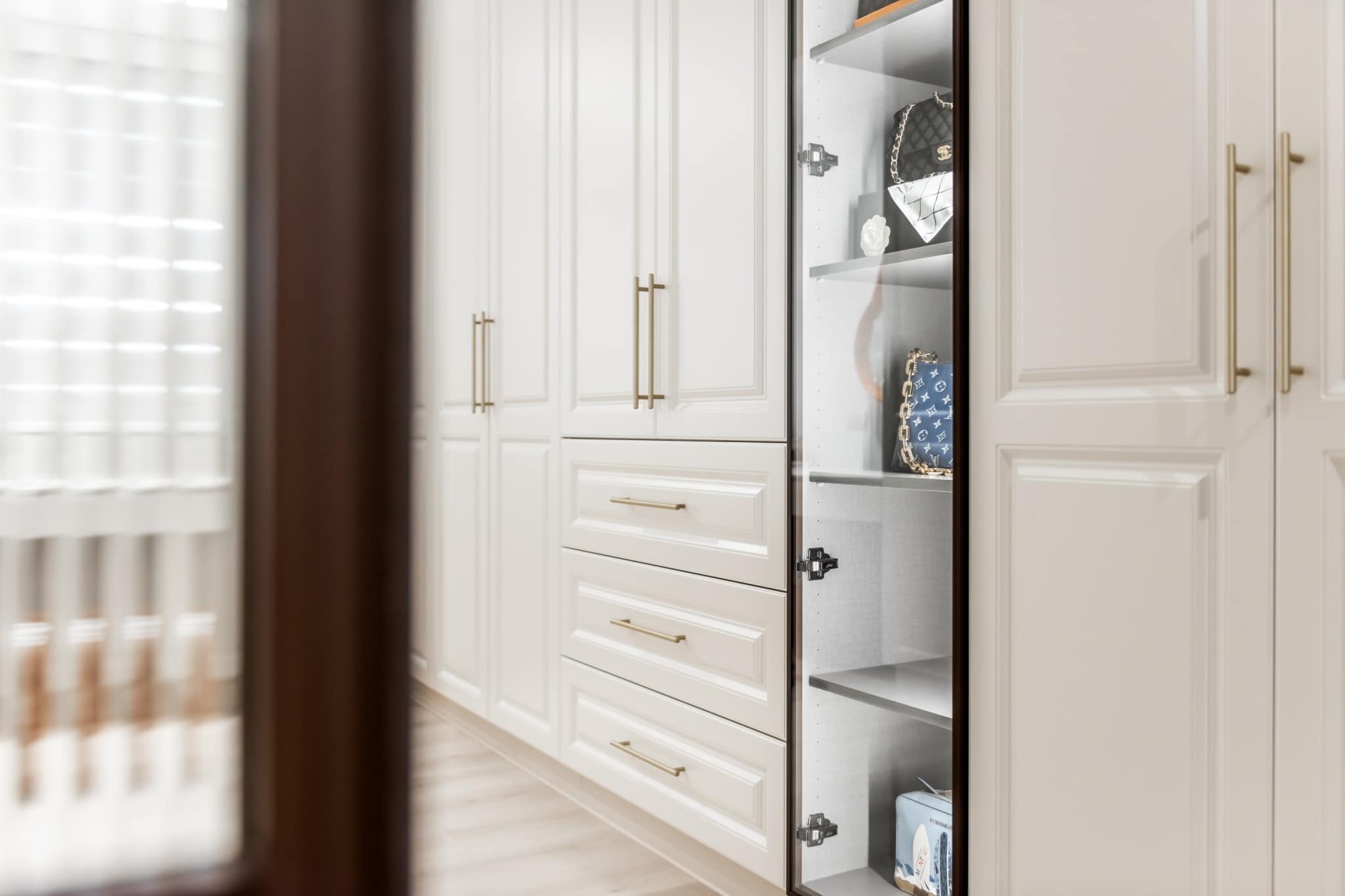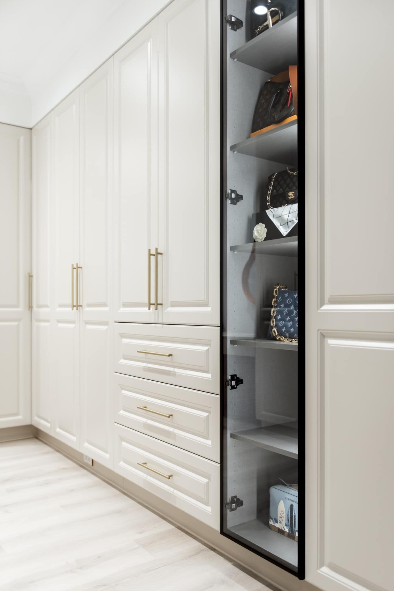 玻璃門的包包柜和飾品柜展現(xiàn)了對(duì)細(xì)節(jié)的精致關(guān)照。透明的玻璃門不僅將包包和飾品呈現(xiàn)得清晰可見,還為空間增加了一份輕盈感。每一款包包和飾品都如藝術(shù)品般擺放其中,使整個(gè)空間呈現(xiàn)出一種高雅的品味。