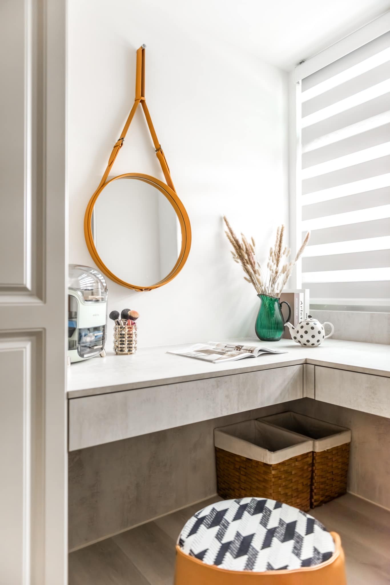 梳妝臺(tái)的設(shè)計(jì)體現(xiàn)了對(duì)美的追求和細(xì)致入微的生活態(tài)度。鏡面的運(yùn)用使空間更顯寬敞,同時(shí)為主人提供了一個(gè)獨(dú)特而私密的美容角落。搭配簡(jiǎn)約而精致的儲(chǔ)物設(shè)計(jì),不僅方便了日常護(hù)理和化妝步驟,也讓整個(gè)梳妝過(guò)程變得更加輕松愉悅。