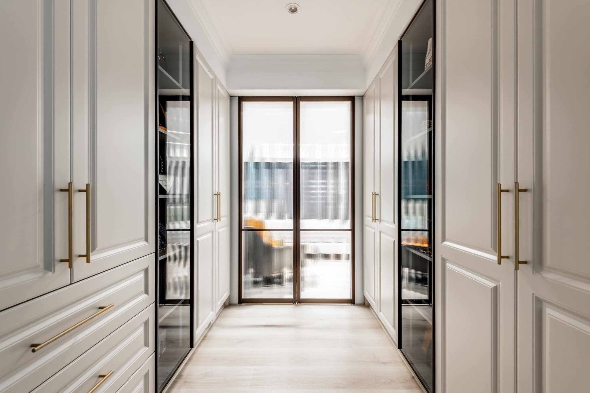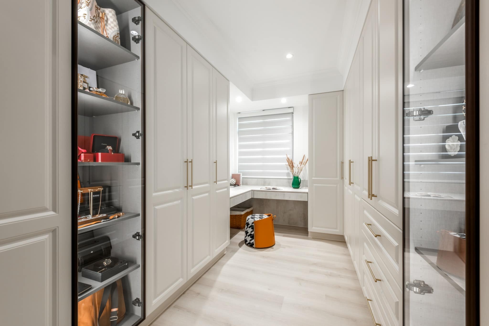純白的衣帽間組合柜、梳妝臺(tái)、玻璃門的包包柜和飾品柜,共同構(gòu)筑了一個(gè)令人陶醉的空間,將簡(jiǎn)約、優(yōu)雅和實(shí)用完美融合。
