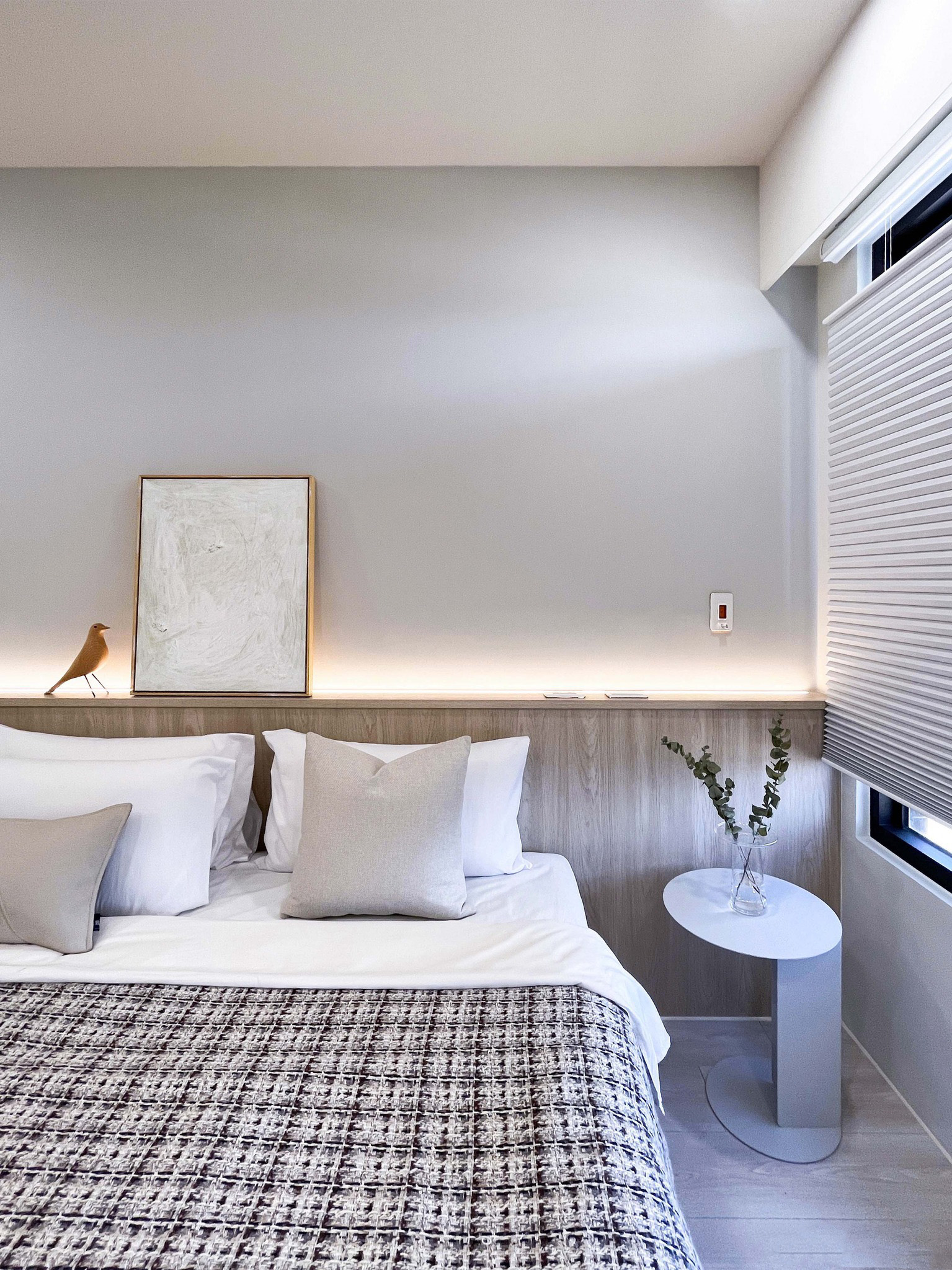 簡(jiǎn)約臥室設(shè)計(jì),巧妙融合木地板與床頭原木墻裙。高級(jí)的淡灰墻色和純白吊頂共同創(chuàng)造出一種層次分明的視覺效果,使整個(gè)臥室空間顯得更加寬敞通透。
