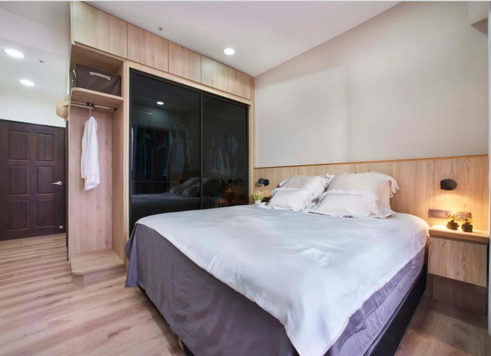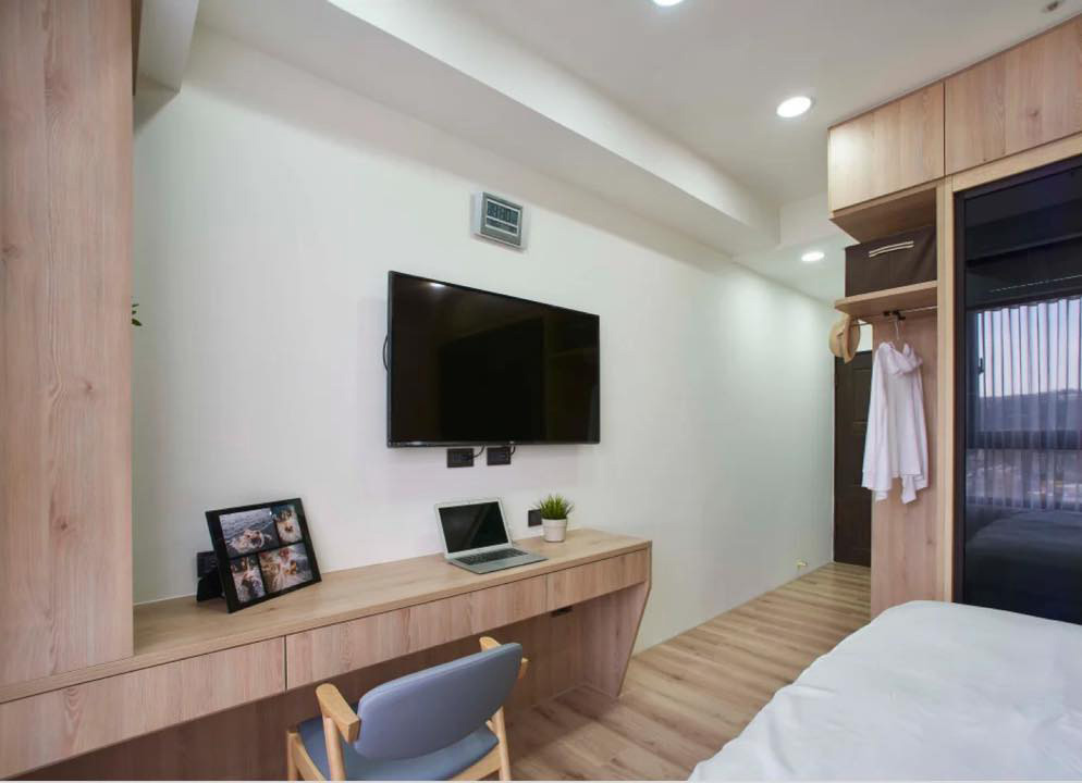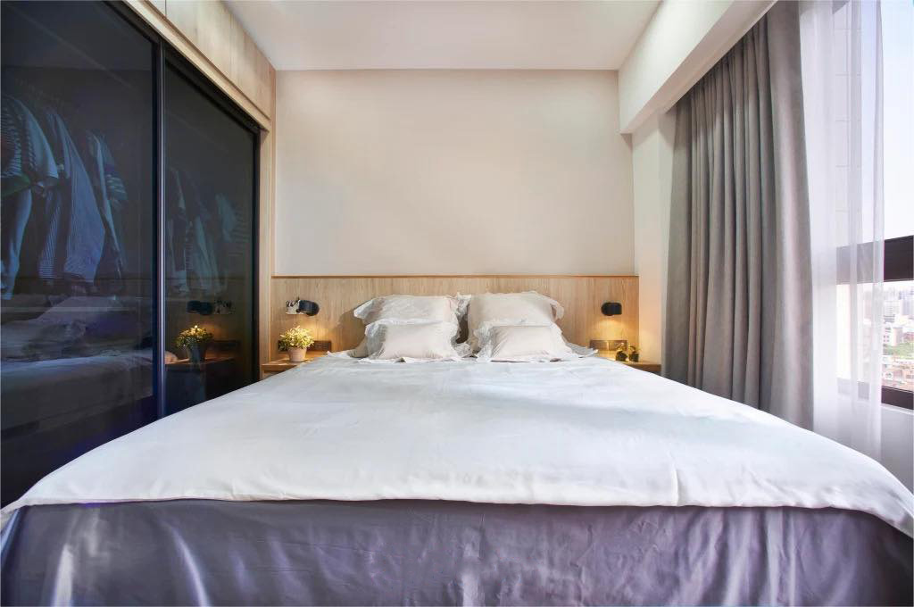 小臥室的規(guī)劃需要精心考慮每一寸空間,而推拉門、懸空床頭柜和床尾書桌的設計,不僅使空間合理利用,同時也為居住者帶來了更為便利和愉悅的居住體驗。這是一個小而巧妙的空間,充滿了溫馨與智慧。