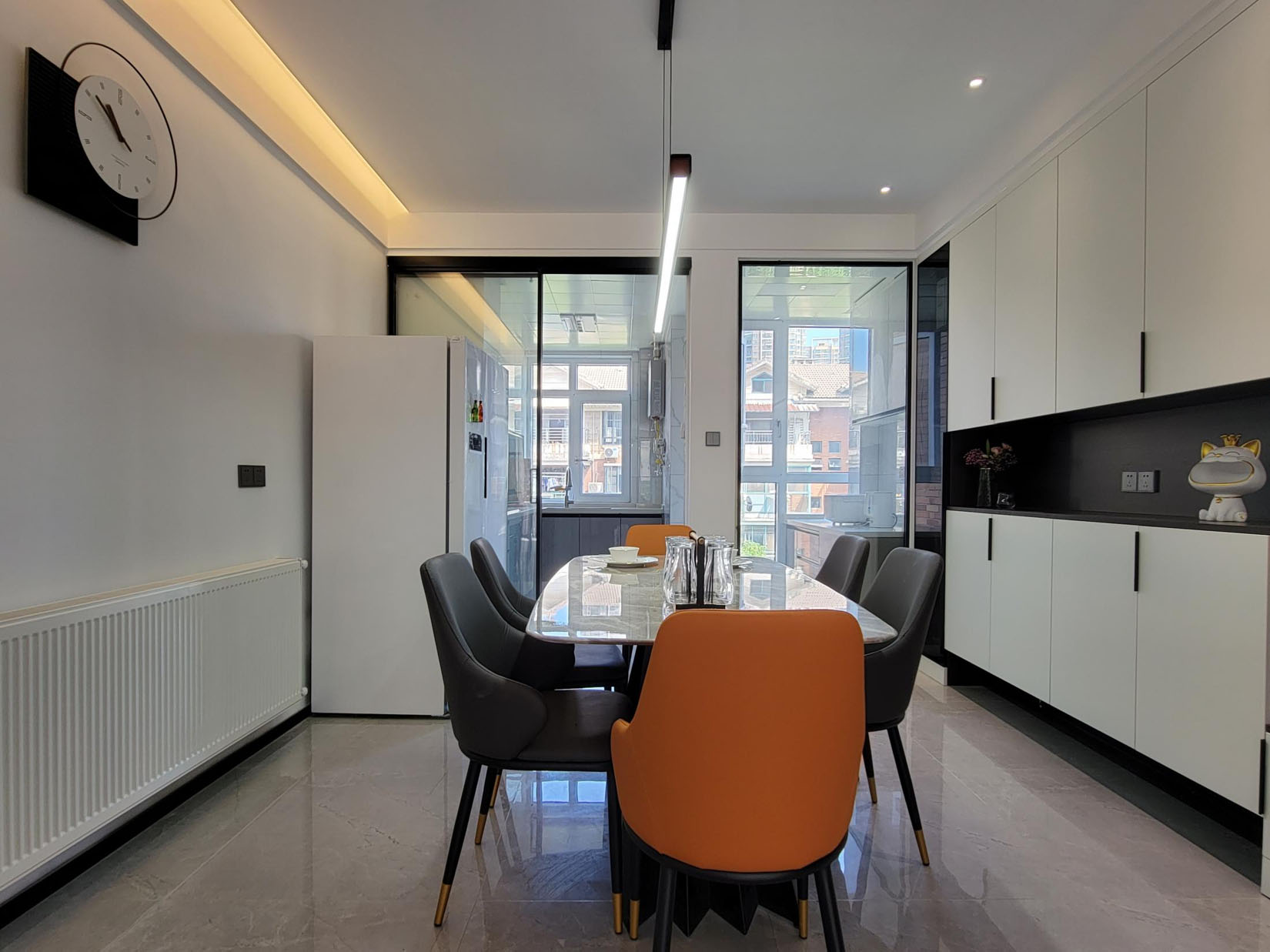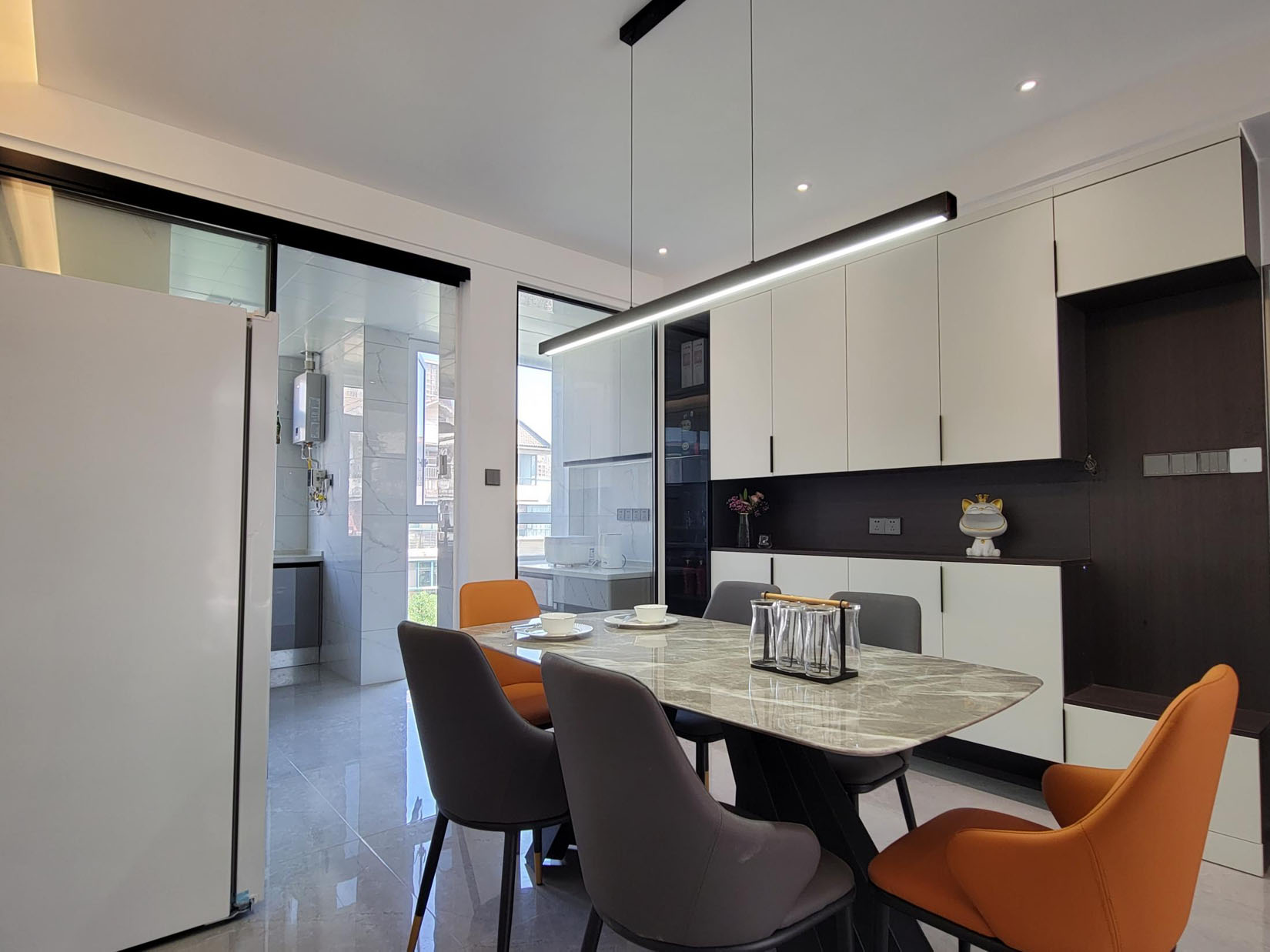 餐廳與廚房相連的開放式布局,讓空間更具通透感。中央擺放的六人石紋餐桌,簡潔大氣,石紋設(shè)計與整體風(fēng)格完美呼應(yīng)。上方的黑色線型吊燈為餐廳增添了一份現(xiàn)代感與層次感,簡潔的設(shè)計不會搶占過多的視線,卻恰到好處地提升了整體的氛圍。