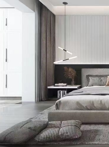 臥室的設(shè)計偏向輕奢風(fēng)格,簡潔而不失精致感。灰色的床鋪位于房間中央,床頭的三色拼接設(shè)計——原木、白色與深灰色交織,既現(xiàn)代又溫馨,營造出舒適的休息氛圍。床頭兩側(cè)的現(xiàn)代風(fēng)吊燈和小巧的床頭柜設(shè)計,精致卻不張揚,充滿了現(xiàn)代生活的精致感。地面鋪設(shè)的毛絨地毯,帶來了柔軟的腳感,使整個空間更顯溫暖與舒適。